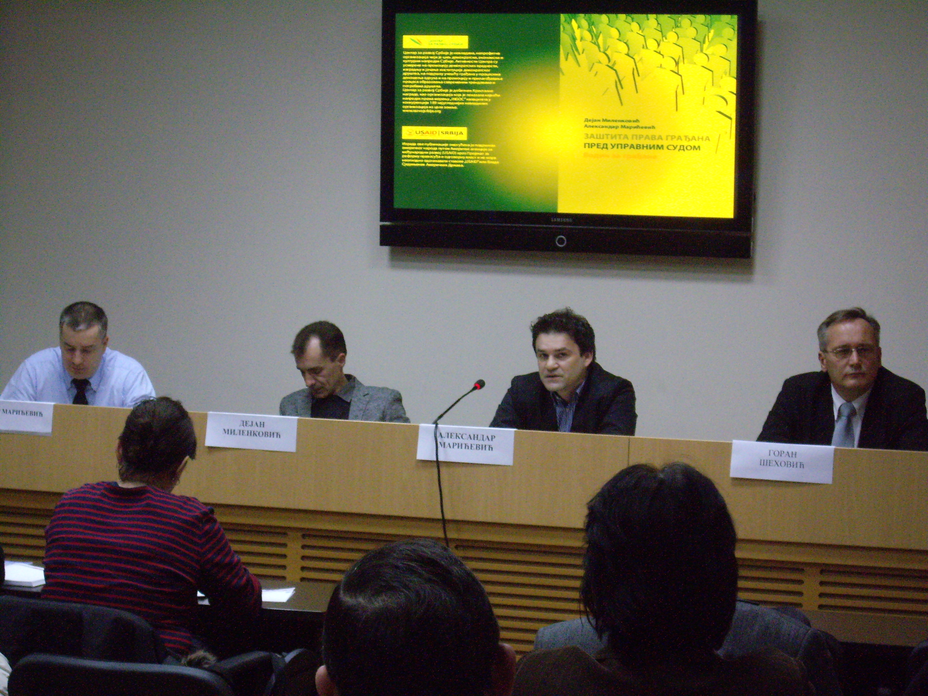 Центар за развој Србије уз подршку Америчке агенције за међународни развој (USAID) кроз Пројекат за реформу правосуђа и одговорну власт је објавио публикацију: „Заштита права грађана пред Управним судом – Водич за грађане“. Публикацију су написали др Дејан Миленковић и Александар Марићевић, дипл. правник, док је уводну реч написала в.ф. председника Управног суда, Слађана Бојовић. Публикација је намењена грађанима и представницима различитих институција и организација када се у остваривању права која им по закону припадају и обављању делатности сусрећу са незаконитим одлукама односно актима органа управе. Уколико нисте задовољни одлукама пореске управе поводом пореза или такси, Инспектората за рад, царинских органа,или неке другог од 54 органа државне управе – имате право да проверите њихову законитост код независног арбитра – Управног суда Републике Србије. Уколико не можете да повратите своју имовину на основу Закона о реституцији, или не добијате дозволу за изградњу или не можете да легализујете некретнине на основу закона или уколико органи локалне самоуправе у вашем случају нису донели акт у складу са законом и важећим прописима – покрените управни спор. Исто се односи на одлуке јавних предузећа и Владиних агенција. У публикацији ћете наћи практичне савете како да остварите ваша права у поступку пред Управним судом, како да саставите тужбу као физичко или правно лице. Сазнаћете како да се изборите у случају „ћутања администрације“. У оквиру пројкта одржане су промоције у четири града у Србије где Управни суд има своја одељења, у Београду, Крагујевцу, Нишу и Новом Сад, где су присутни грађани и представници организација и институција добили штампане примерке публикације. Партнери у имплеметирању пројекта су били: Агенција за европске интеграције и сарадњу са удружењима града Београда, НВО «Millenium», Новосадска новинарска школа и «Protecta» из Ниша. |