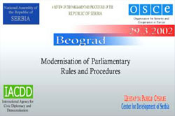 Извештај "Модернизација пословника о раду Народне скупштине Републике Србије" је последица свеобухватне анлизе важећег скупштинског Пословника, коју су спровеле Међународна агенција за грађанску дипломатију и демократизацију (International Agency for Civil Diplomacy and Democratisation - IACDD) и Центар за развој Србије (ЦРС), уз подршку мисије ОЕБС-а у СРЈ.